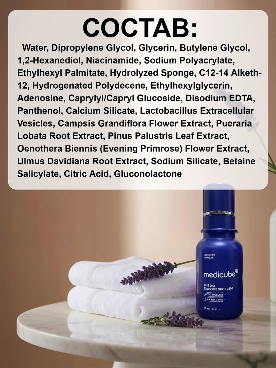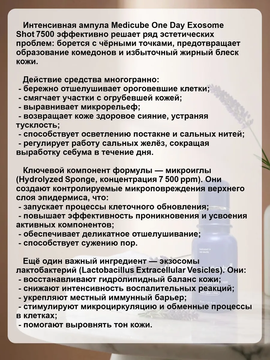 Интенсивная ампула Medicube One Day Exosome Shot7500 эффективно решает ряд эстетических проблем: борется с чёрными точками, предотвращает образование комедонов и избыточный жирный блеск кожи.