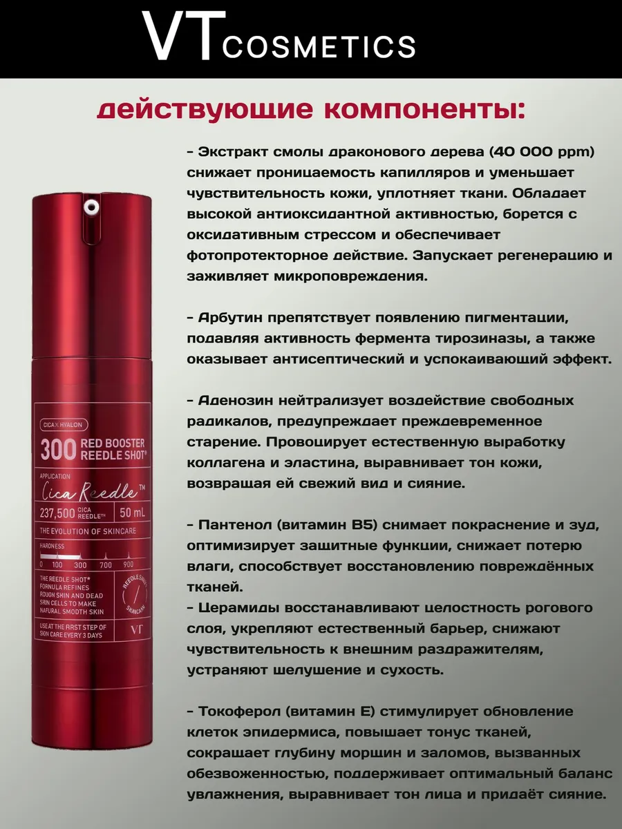 VT Cosmetics Red Booster Reedle Shot300 — интенсивный бустер, сочетающий микроигольчатую технологию и антиоксиданты для комплексного ухода за кожей. Его действие многогранно: