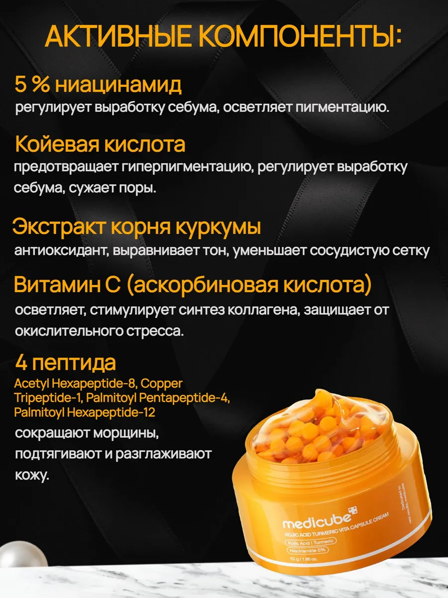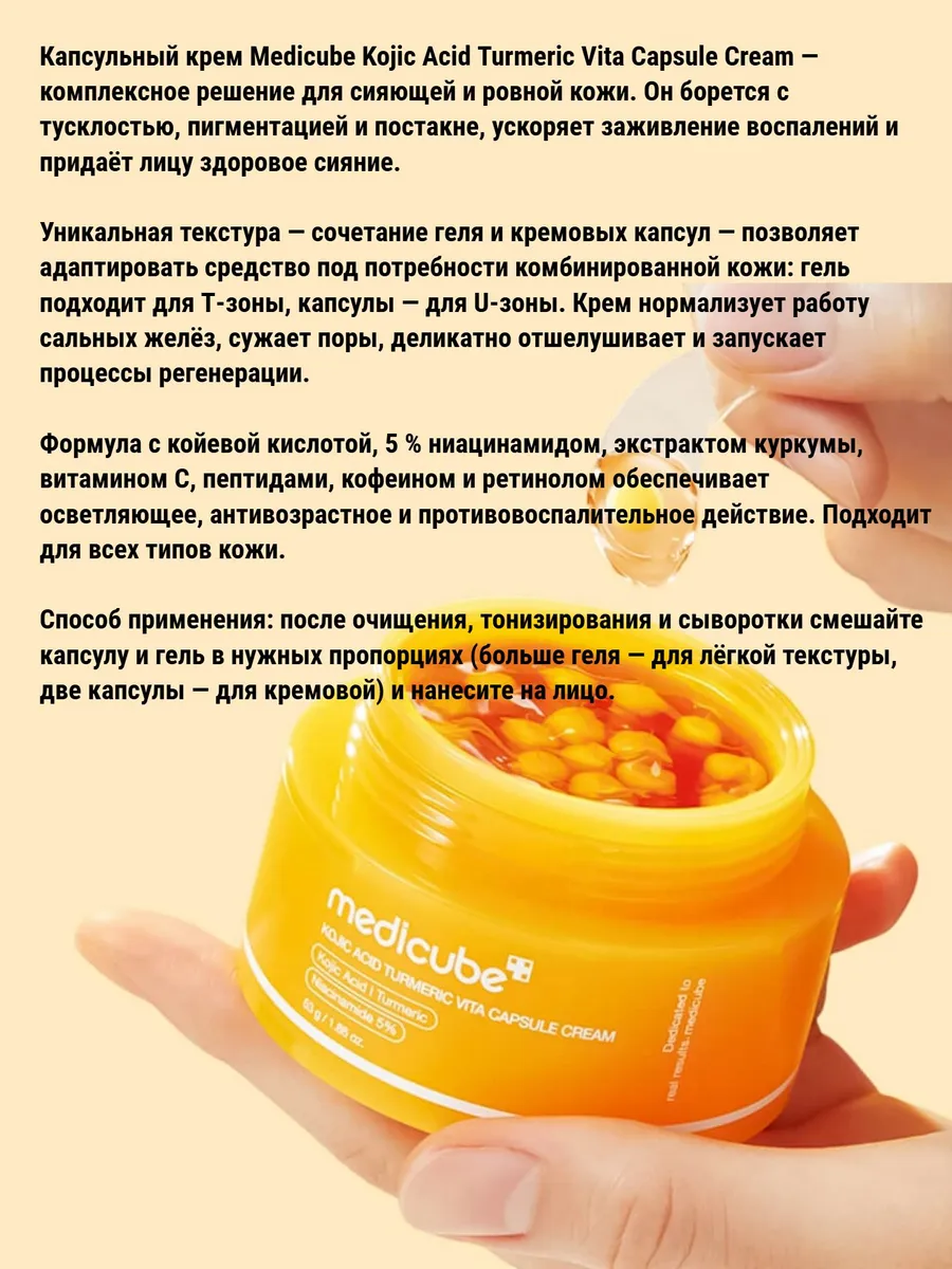 Капсульный крем Medicube Kojic Acid Turmeric Vita Capsule Cream — комплексное решение для сияющей и ровной кожи. Он борется с тусклостью, пигментацией и постакне, ускоряет заживление воспалений и придаёт лицу здоровое сияние. Уникальная текстура — сочетание геля и кремовых капсул — позволяет адаптировать средство под потребности комбинированной кожи: гель подходит для Т‑зоны, капсулы — для U‑зоны. Крем нормализует работу сальных желёз, сужает поры, деликатно отшелушивает и запускает процессы регенерации.