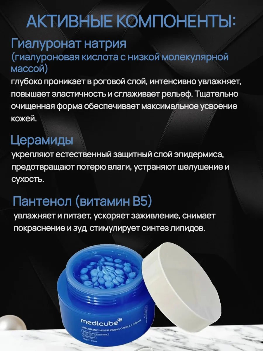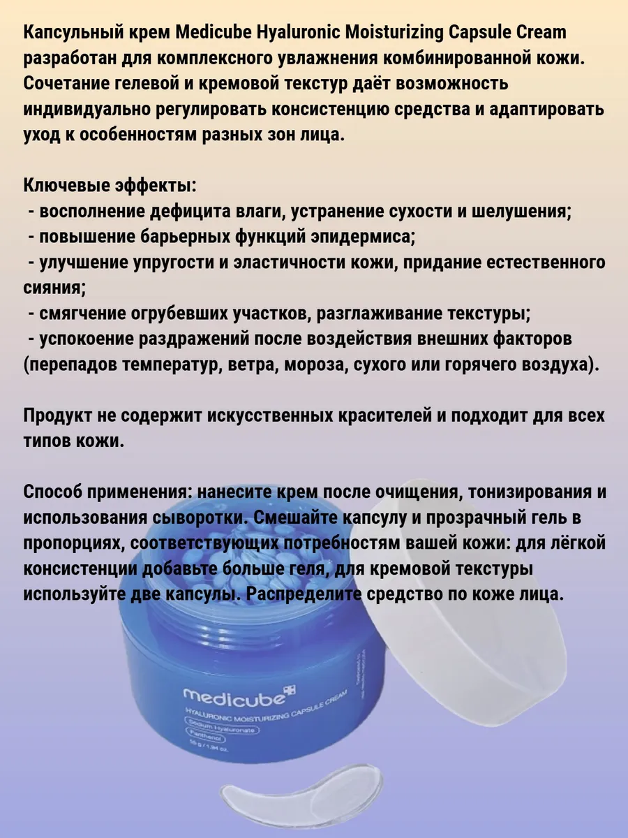 Капсульный крем Medicube Hyaluronic Moisturizing Capsule Cream — идеальное решение для комбинированной кожи. Уникальное сочетание гелевой и кремовой текстур позволяет адаптировать уход под потребности разных зон лица. Крем интенсивно увлажняет, устраняет сухость и шелушение, придаёт коже упругость и естественное сияние. Успокаивает раздражения после воздействия неблагоприятных погодных факторов, смягчает огрубевшие участки и укрепляет защитный барьер эпидермиса. Формула без искусственных красителей содержит гиалуронат натрия, церамиды, пантенол, ниацинамид, сквалан, аллантоин и бетаин — для комплексного ухода за кожей любого типа.