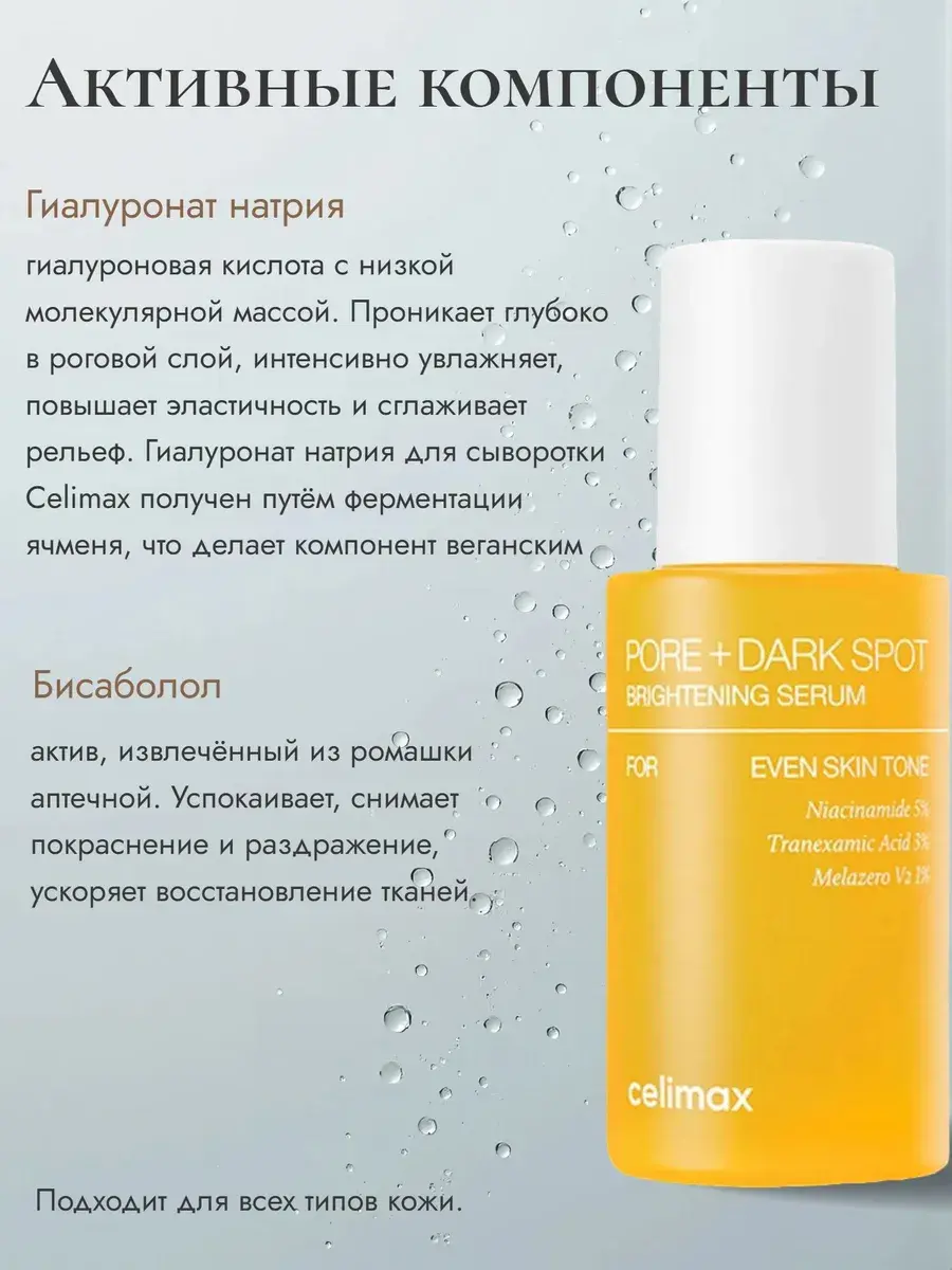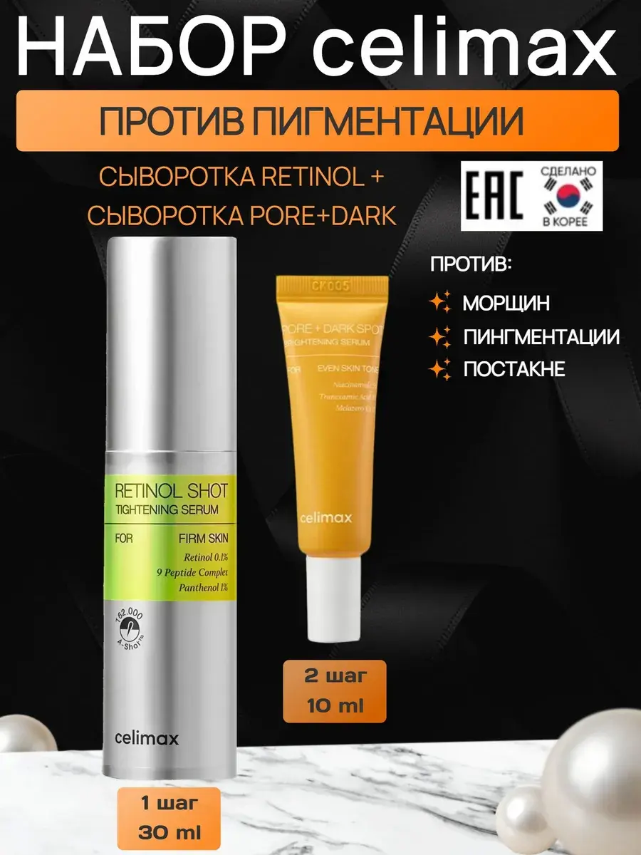Набор с микроиглами и ретинолом состоит из: 1. сыворотки CELIMAX The Vita-A Retinol Shot (30 мл) 2. Сыворотки для выравнивания тона и рельефа кожи 10 мл Средства для ухода оказывают лифтинг-эффект, предотвращают птоз тканей, сокращают статические и мимические морщины, разглаживает микрорельеф - уменьшают размер и глубину пор за счёт повышения упругости и эластичности, сыворотка с транексамовой кислотой борется с пигментацией и постакне; Ретинол (0,1%) стимулирует обновление на клеточном уровне, активизирует выработку коллагена и эластина. Cнижает риск развития акне, уменьшения размера и глубины пор и разглаживания морщин. A-ShotTM — запатентованный комплекс микроигл (20 250) обеспечивает доставку активно действующих компонентов в глубокие слои эпидермиса и стимулирует процессы обновления клеток. Оказывает деликатное отшелушивающее действие, способствует сокращению гиперпигментации, выравниванию текстуры кожи. Matrixyl3000 Стимулирует обновление на клеточном уровне, укрепляет внеклеточный матрикс, повышает синтез коллагена и гиалуроновой кислоты, тем самым подтягивает и разглаживает кожу, моделирует овал лица и восстанавливает упругость. Аскорбиновая кислота — нестабильная форма витамина C, которая оказывает наиболее мощное осветляющее и антивозрастное действие. Ниацинамид (витамин B3) способствует стимуляции синтеза коллагена и улучшению защитных функций, помогает снизить трансэпидермальную потерю влаги и устранить пигментацию. Пантенол (1%, витамин B5) восстанавливает целостность рогового слоя. Сыворотка для выравнивания тона и рельефа кожи CelimaxPore+Dark Spot Brightening Serum мягко осветляет пигментацию и постакне, улучшает общий тон, устраняет тусклость и дарит здоровое сияние. Делает текстуру кожи гладкой и равномерной, сужает расширенные поры, сглаживает микрорельеф и осветляет сальные нити. Не провоцирует сухости и раздражения. Содержит 5% ниацинамида, 3% транексамовой кислоты, 1% растительного осветляющего комплекса Melazero, гиалуроновую кислоту и бисаболол.