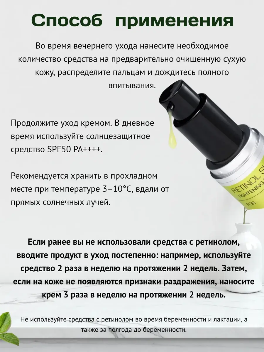 Ретинол (0,1%) стимулирует обновление на клеточном уровне, активизирует выработку коллагена и эластина. Cнижает риск развития акне, уменьшения размера и глубины пор и разглаживания морщин.