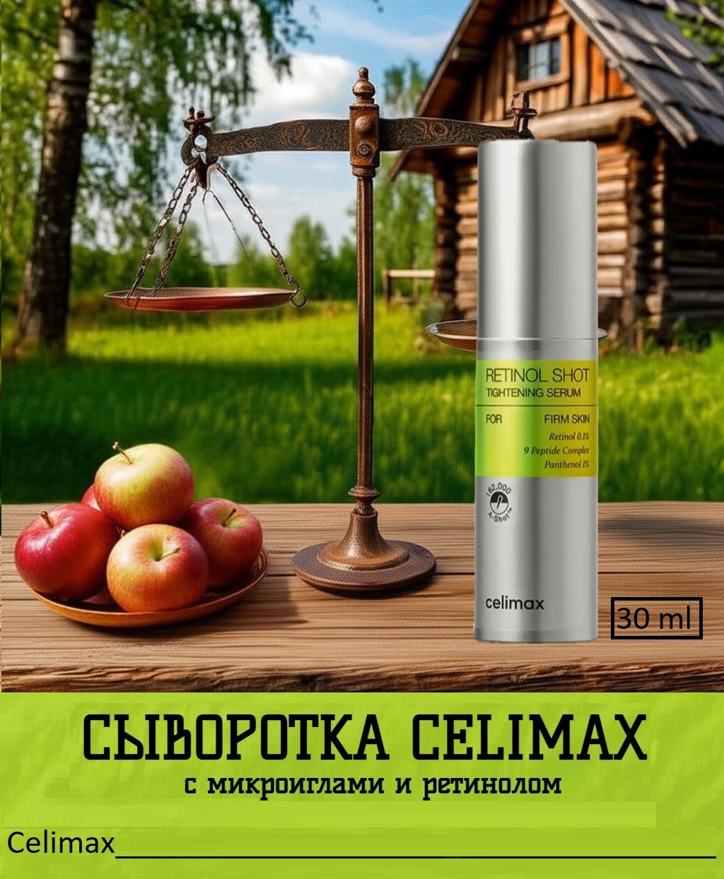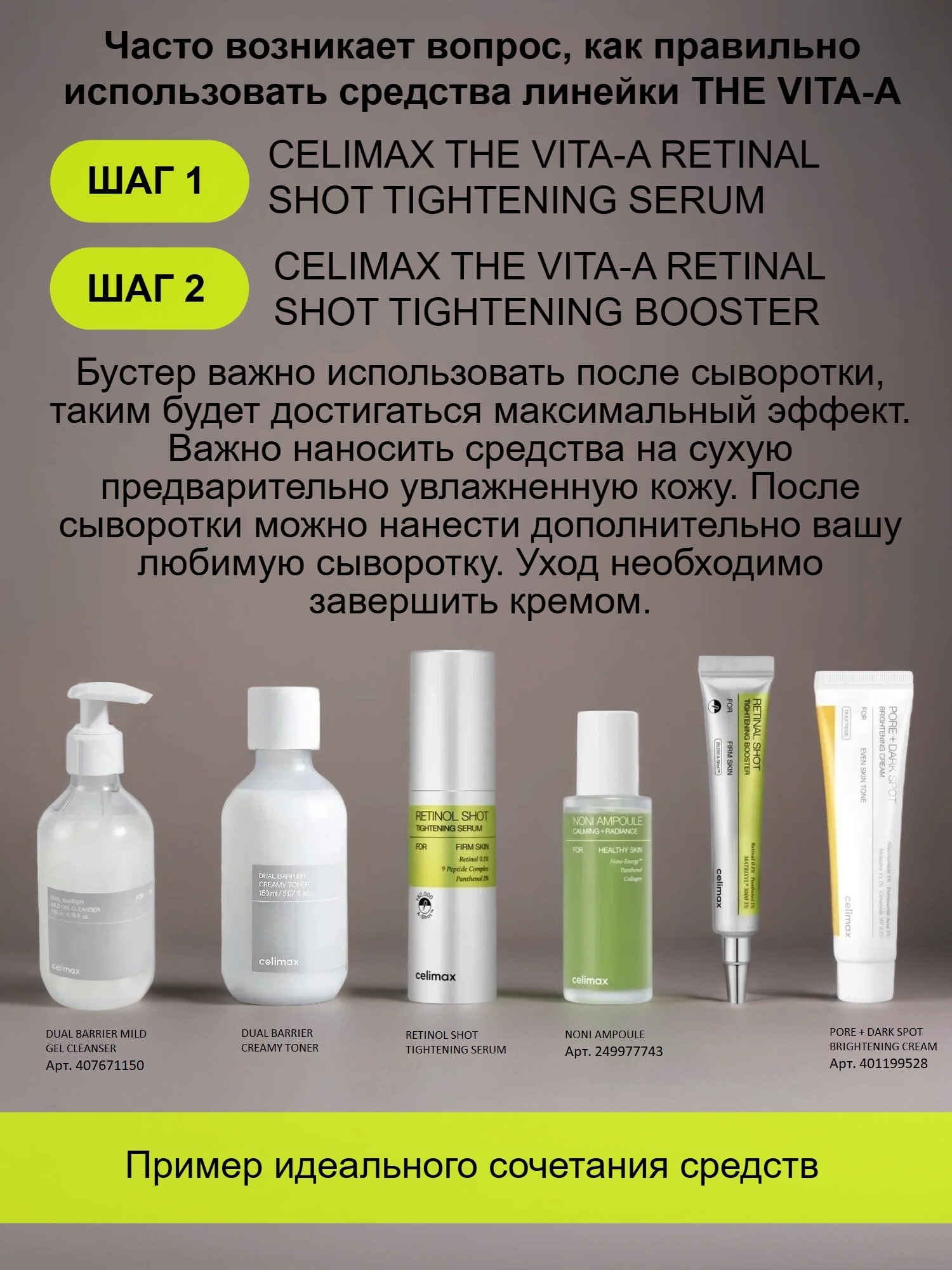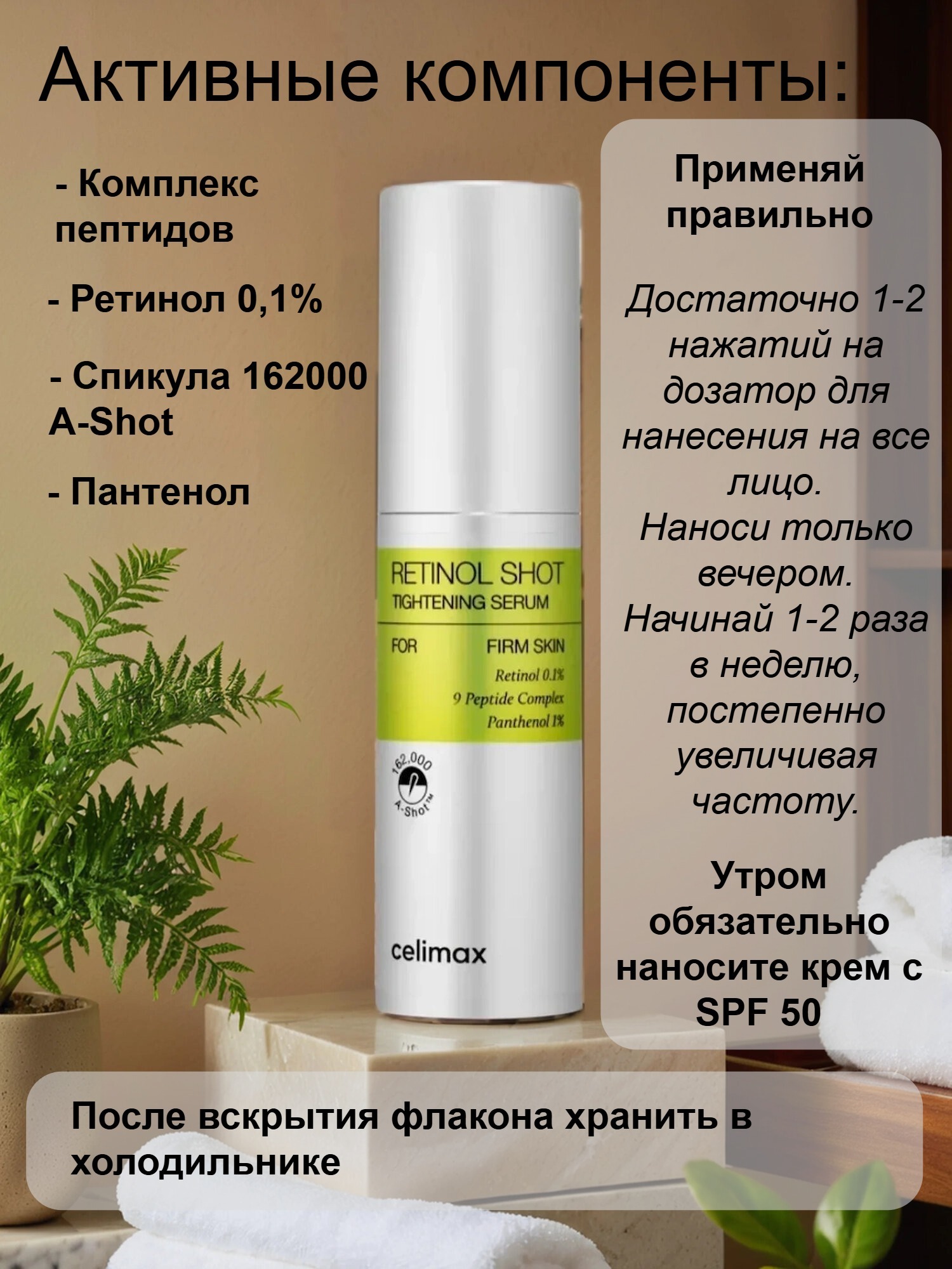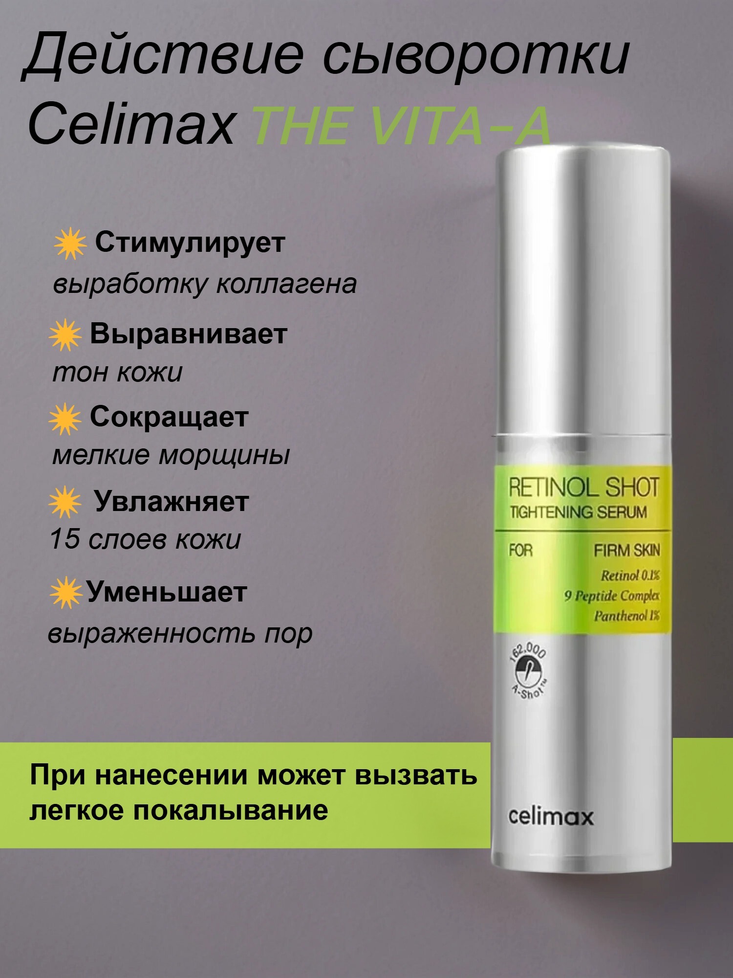 Подтягивающая сыворотка с ретинолом и микроиглами CelimaxThe Vita−A Retinol Shot Tightening Serum обеспечивает интенсивный уход для кожи с признаками старения и симптомами акне. Обладает лёгкой увлажняющей текстурой, быстро впитывается, не оставляет ощущения стянутости и липкости.