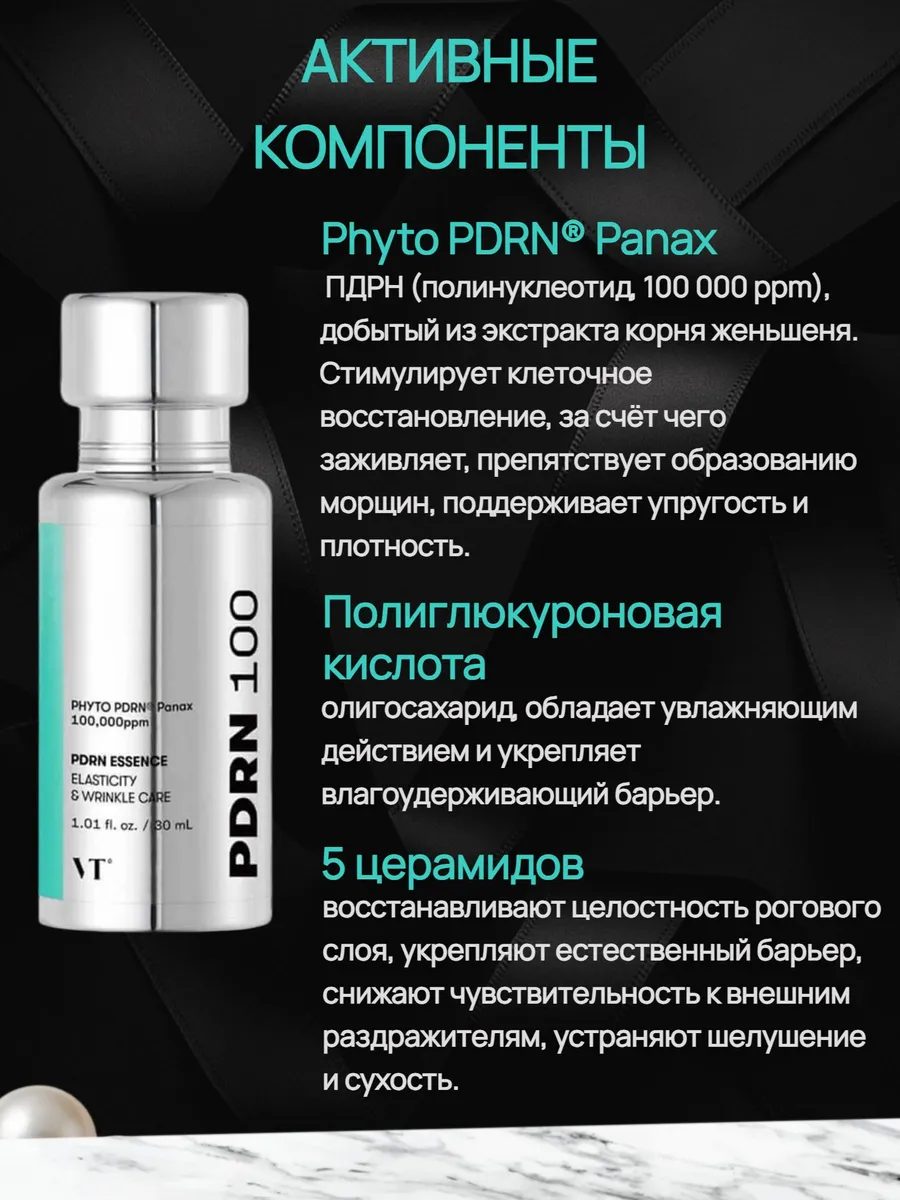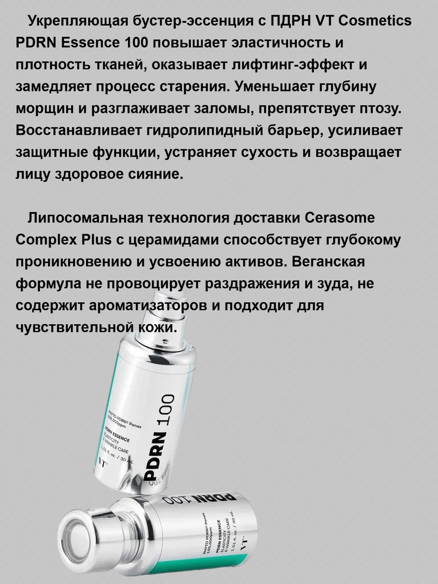 Бустер‑эссенция VT Cosmetics PDRN Essence 100 с полидезоксирибонуклеотидами (ПДРН) — интенсивное средство для антивозрастного ухода. Продукт целенаправленно воздействует на ключевые признаки старения, обеспечивая комплексный эффект: